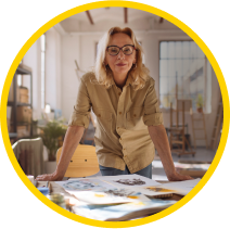 Suzy at work, standing over her desk.